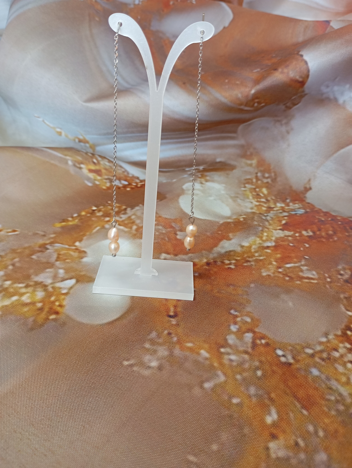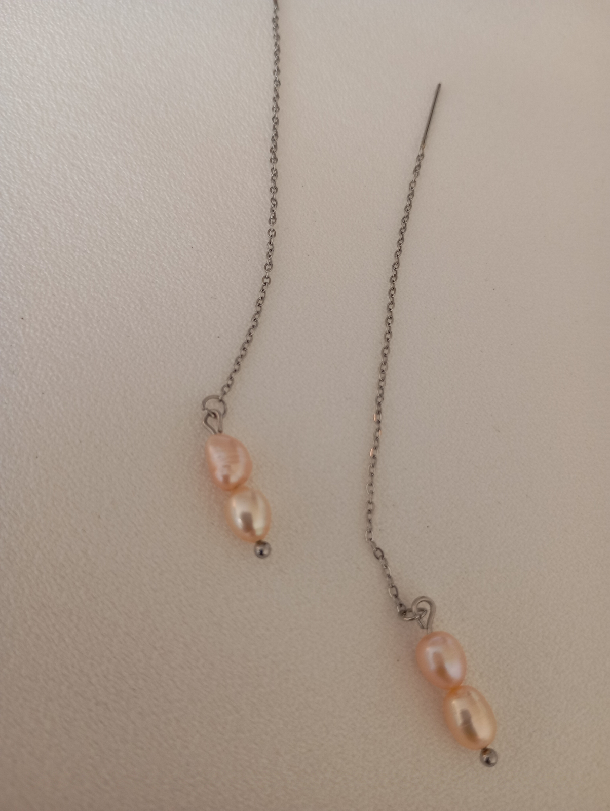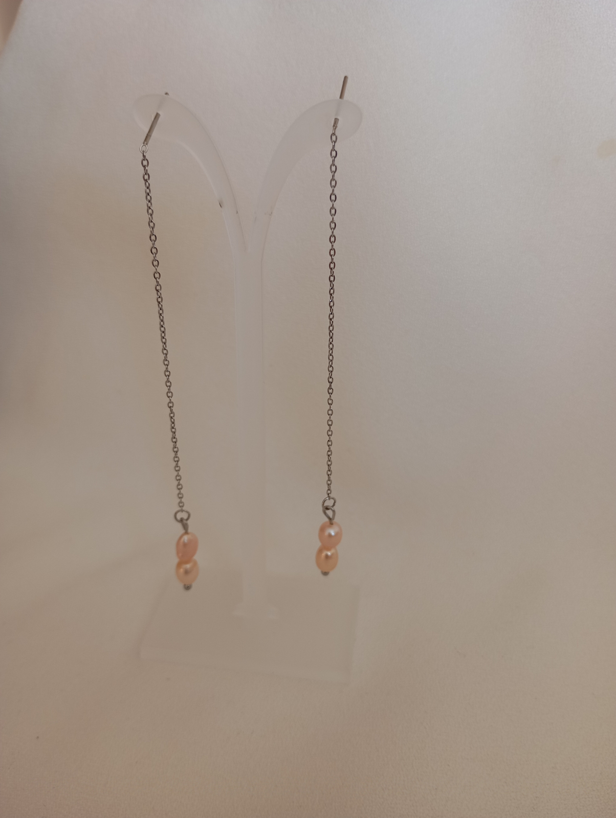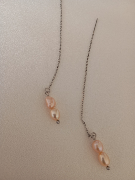 Cercei Perle naturale roz 6 mm, cu tija si lant, 6 cm.