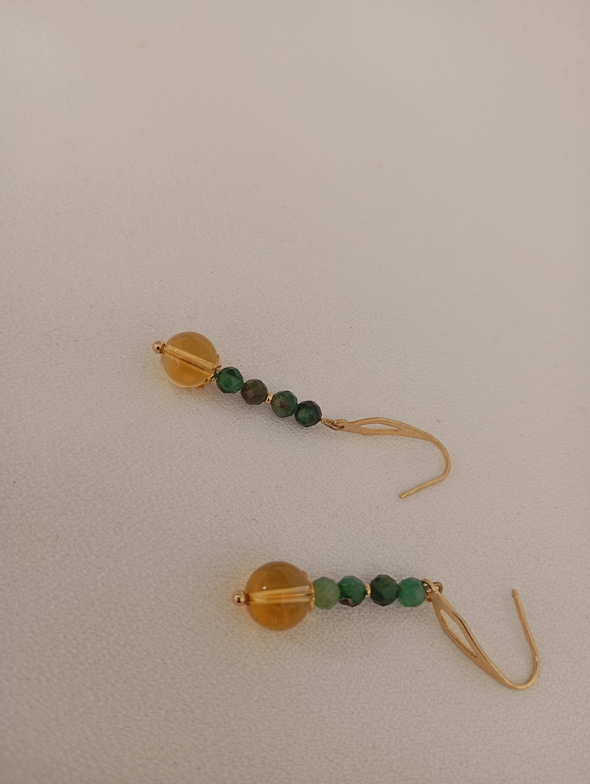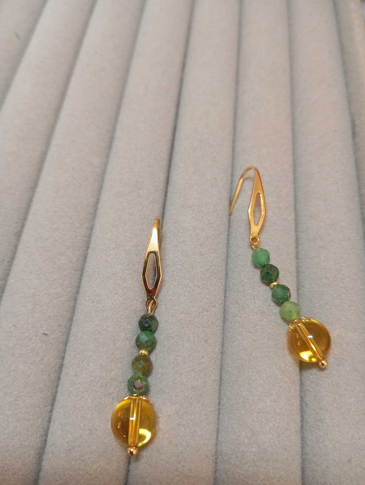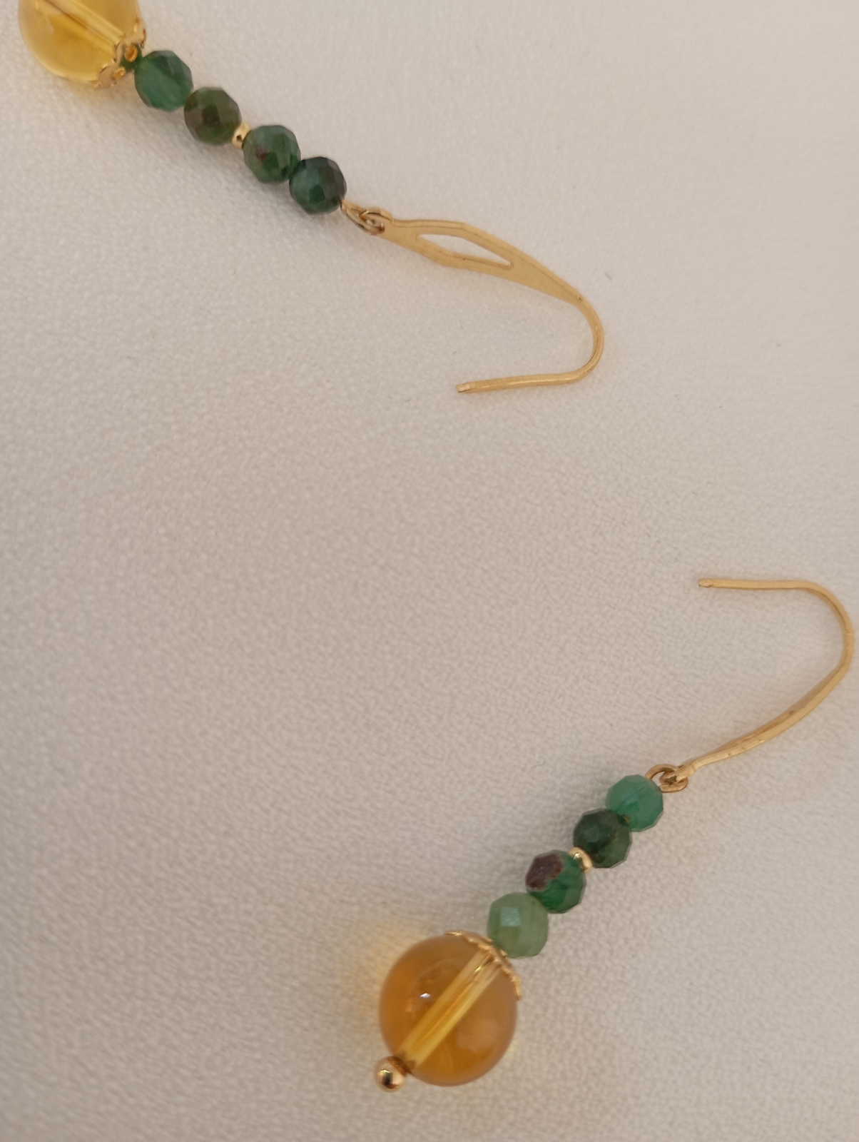 Cercei handmade realizati cu pietre semipretioase Citrin galben miere, 8 mm si margele smarald brut 4 mm.