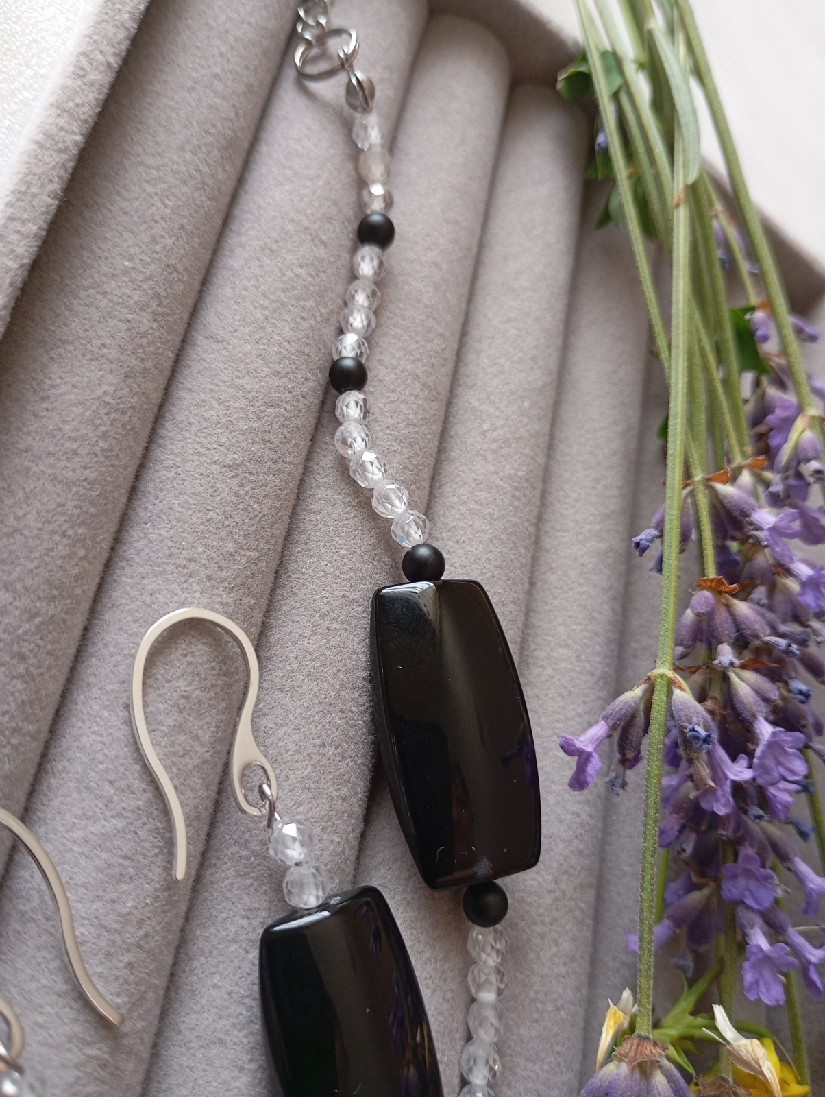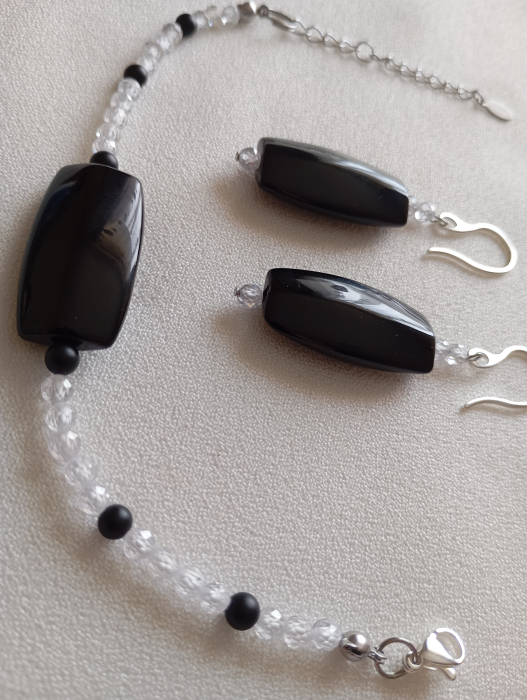 Set de bijuterii handmade, cu accesorii din otel inoxidabil, antialergice, cu pietre mari de onix 3 cm*1.5 cm*0.5 cm, greutate 48 g, combinate cu margelute cubic zirconia pentru a accentua stralucirea pietrelor de onix.