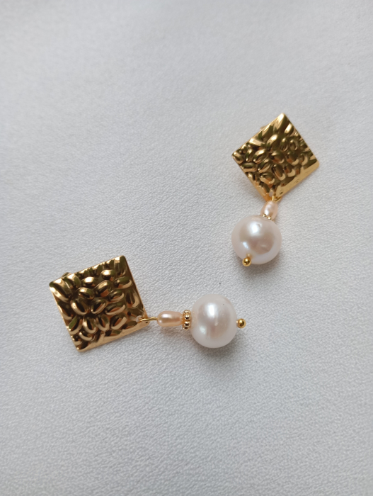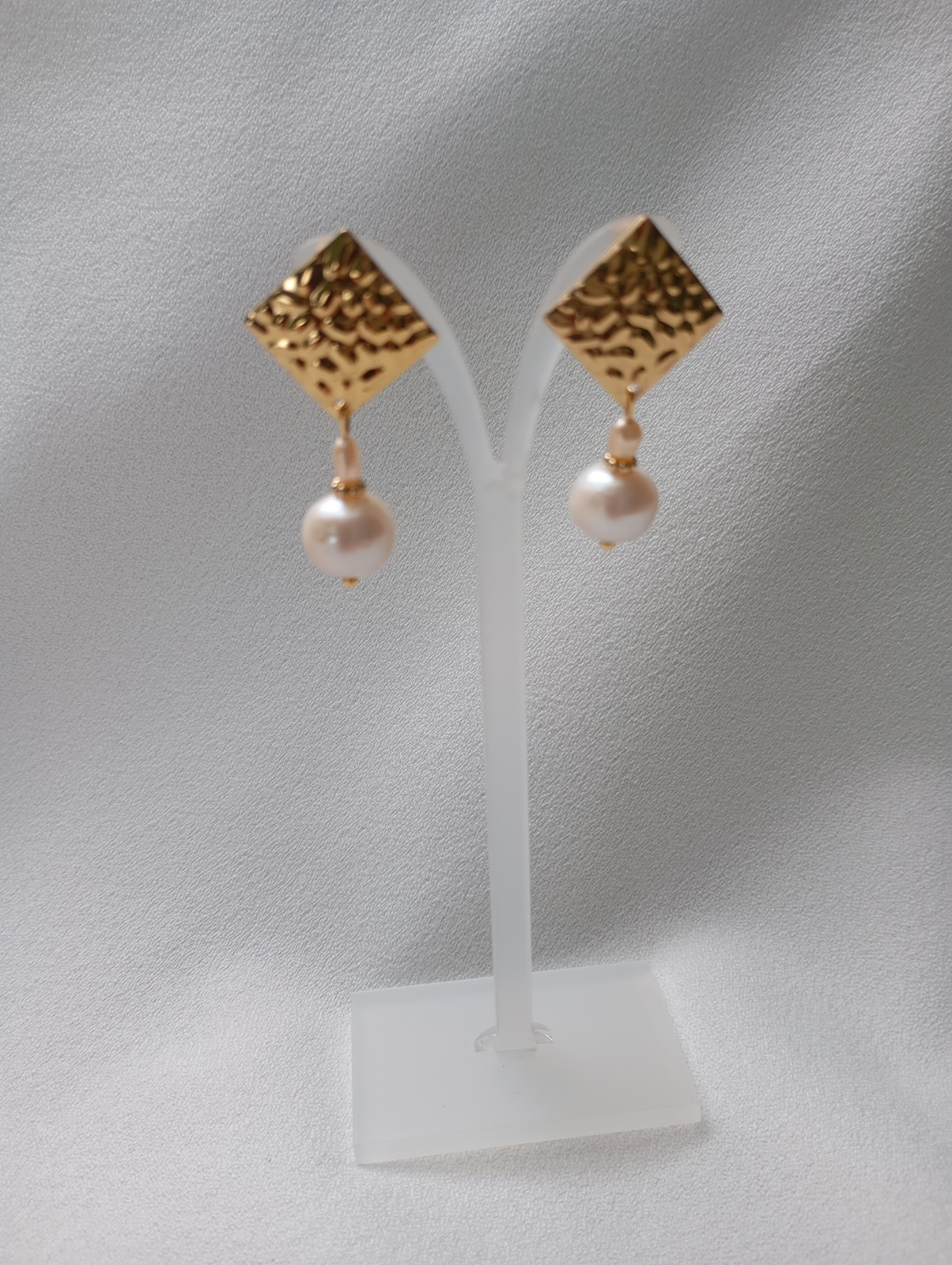 Cercei cu perle de cultura, roz 4mm bob si alba 10mm rotunda, cu margelute floricica si tortite futuriste rombice placate cu aur 18K.