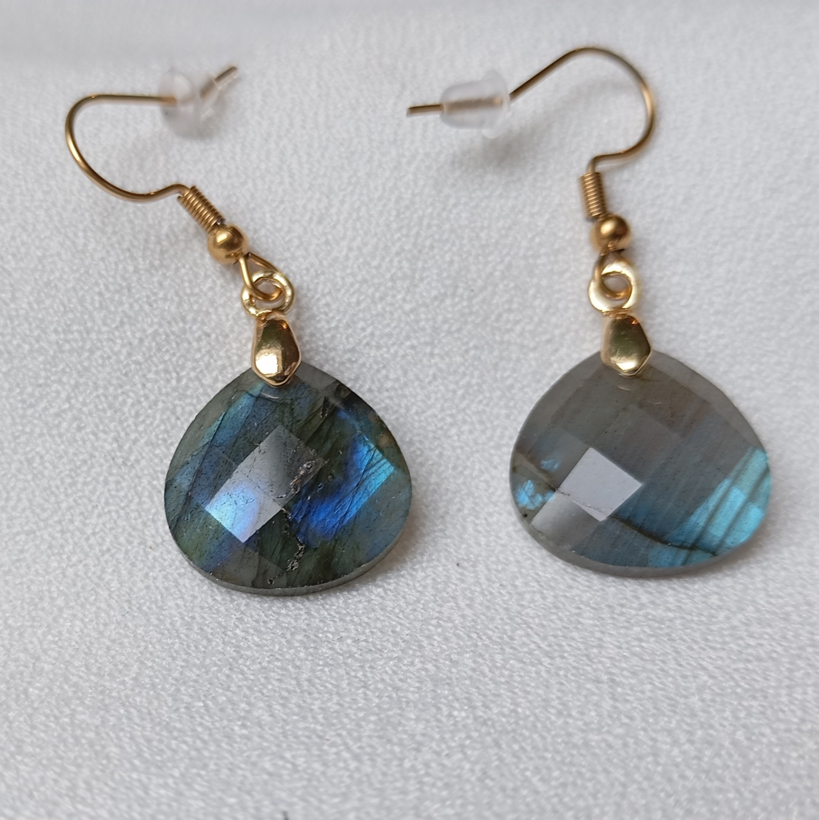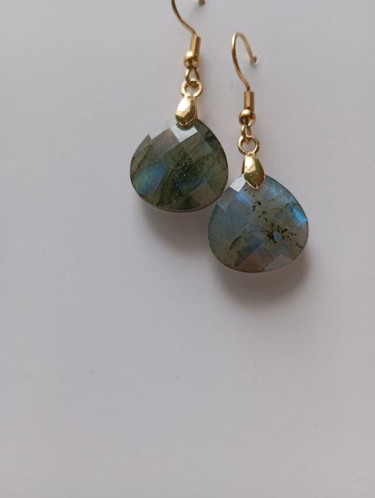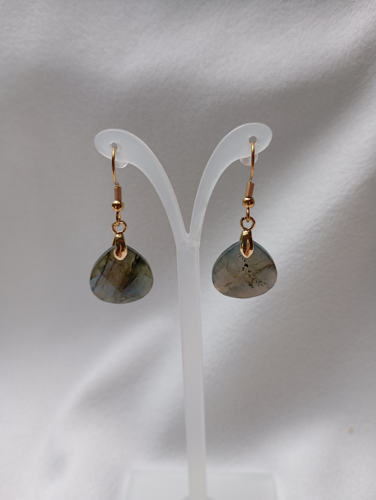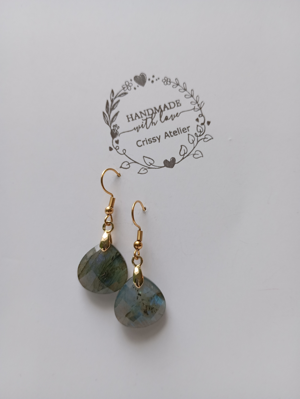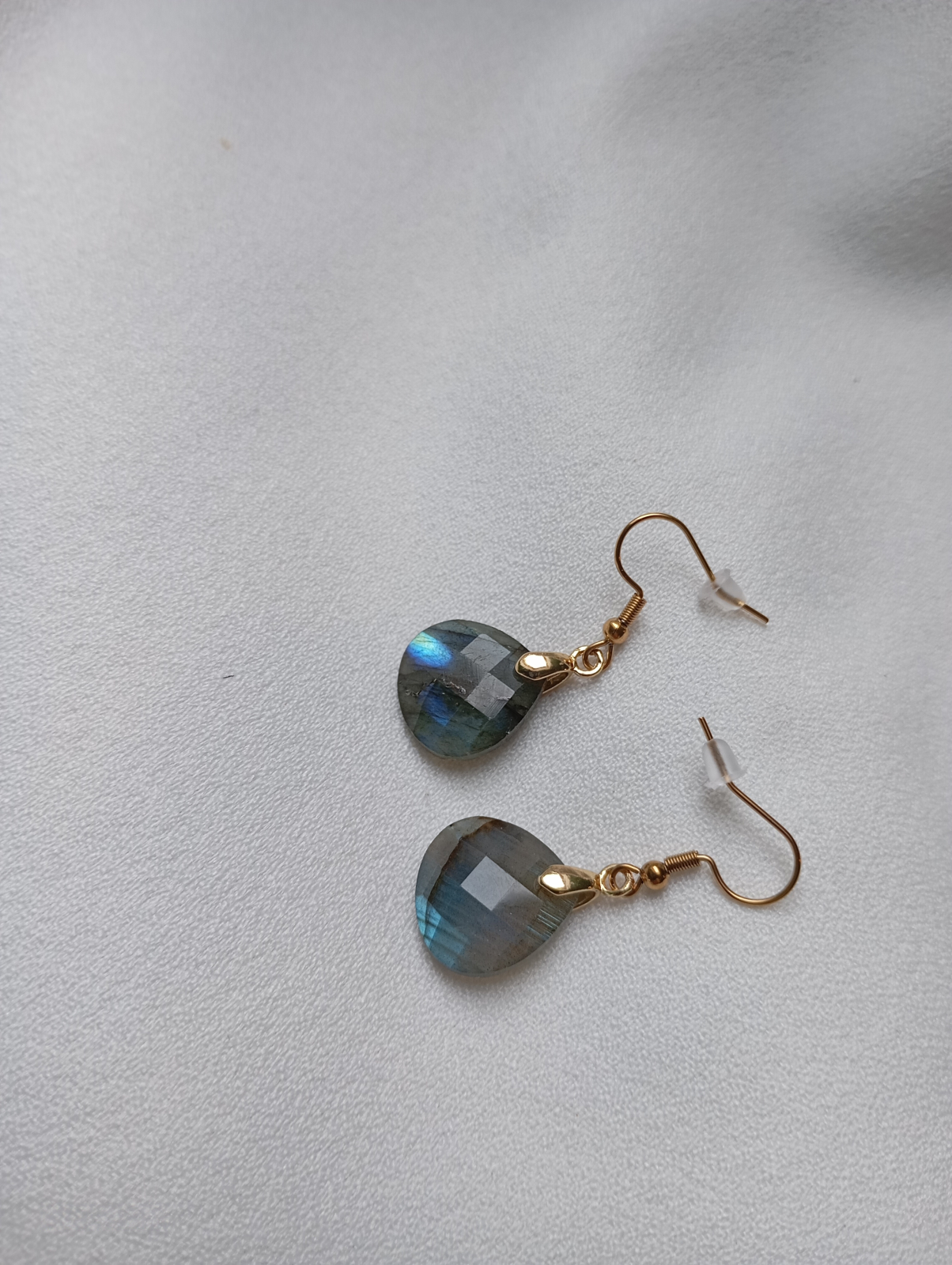 Cercei cu tortite din otel inoxidabil, antialergic si deosebita piatra de Labradorit, culoare gri, partial translucid, cu irizatii albastrui.