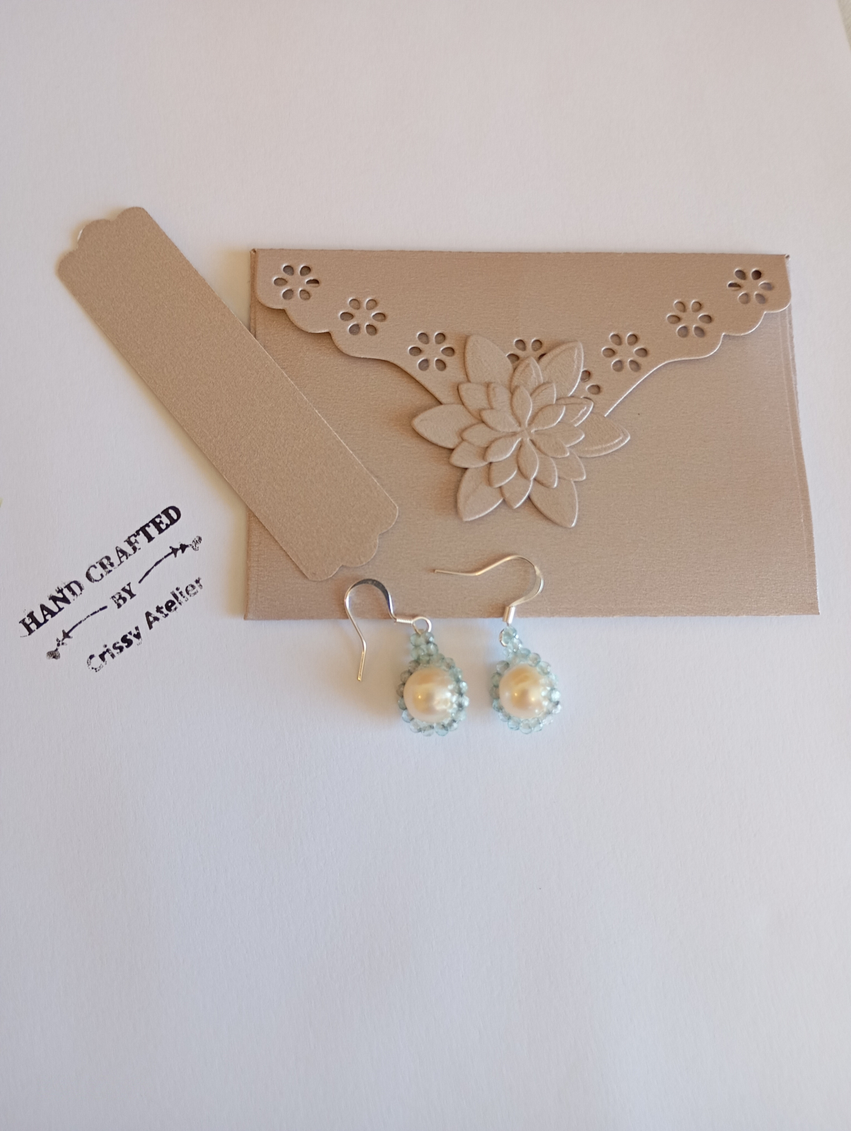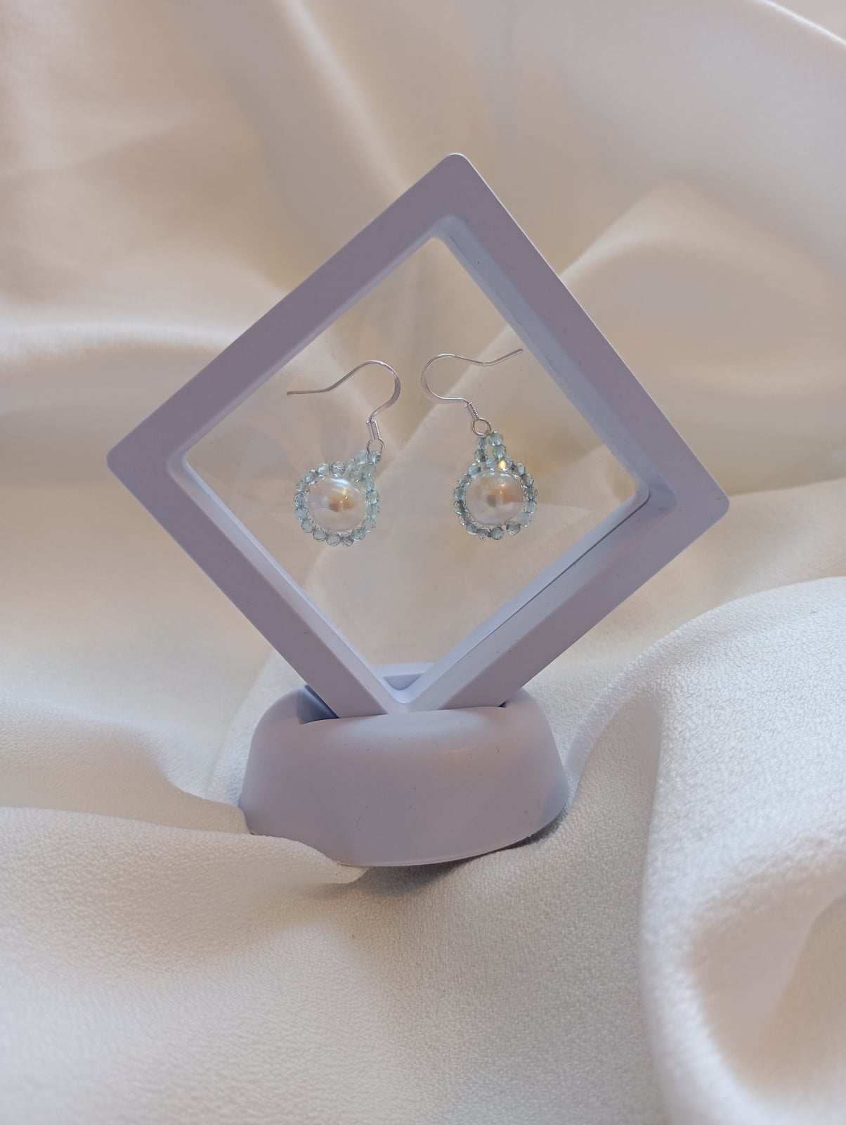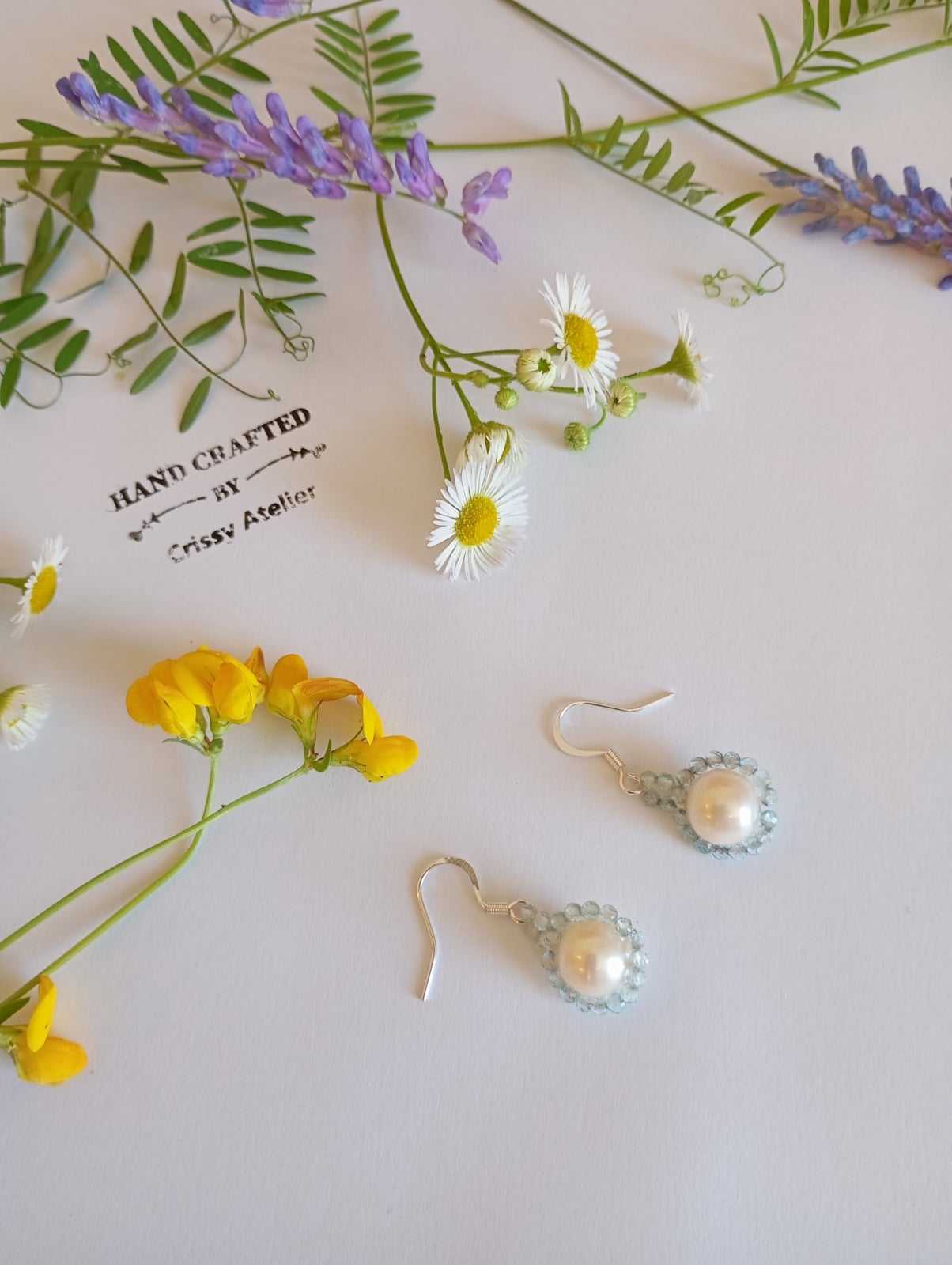 Cerceii sunt realizati manual din perle de cultura albe 10 mm, in cerc din margele 2 mm de topaz bleumarin, pe tortita de otel inoxidabil, antialergic.