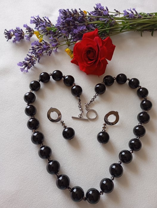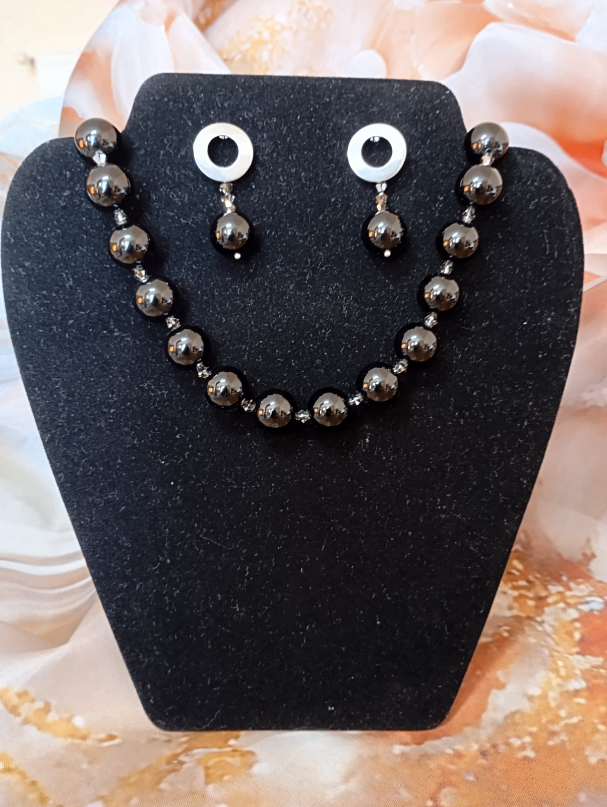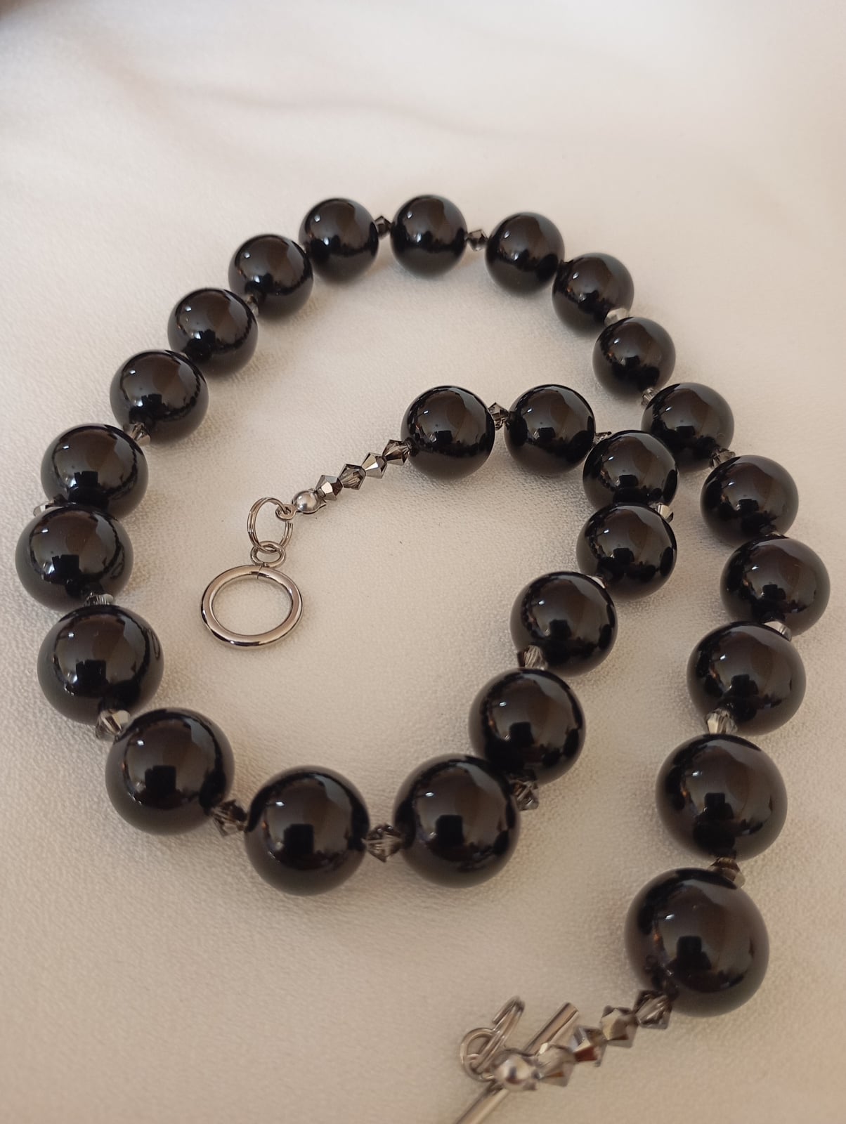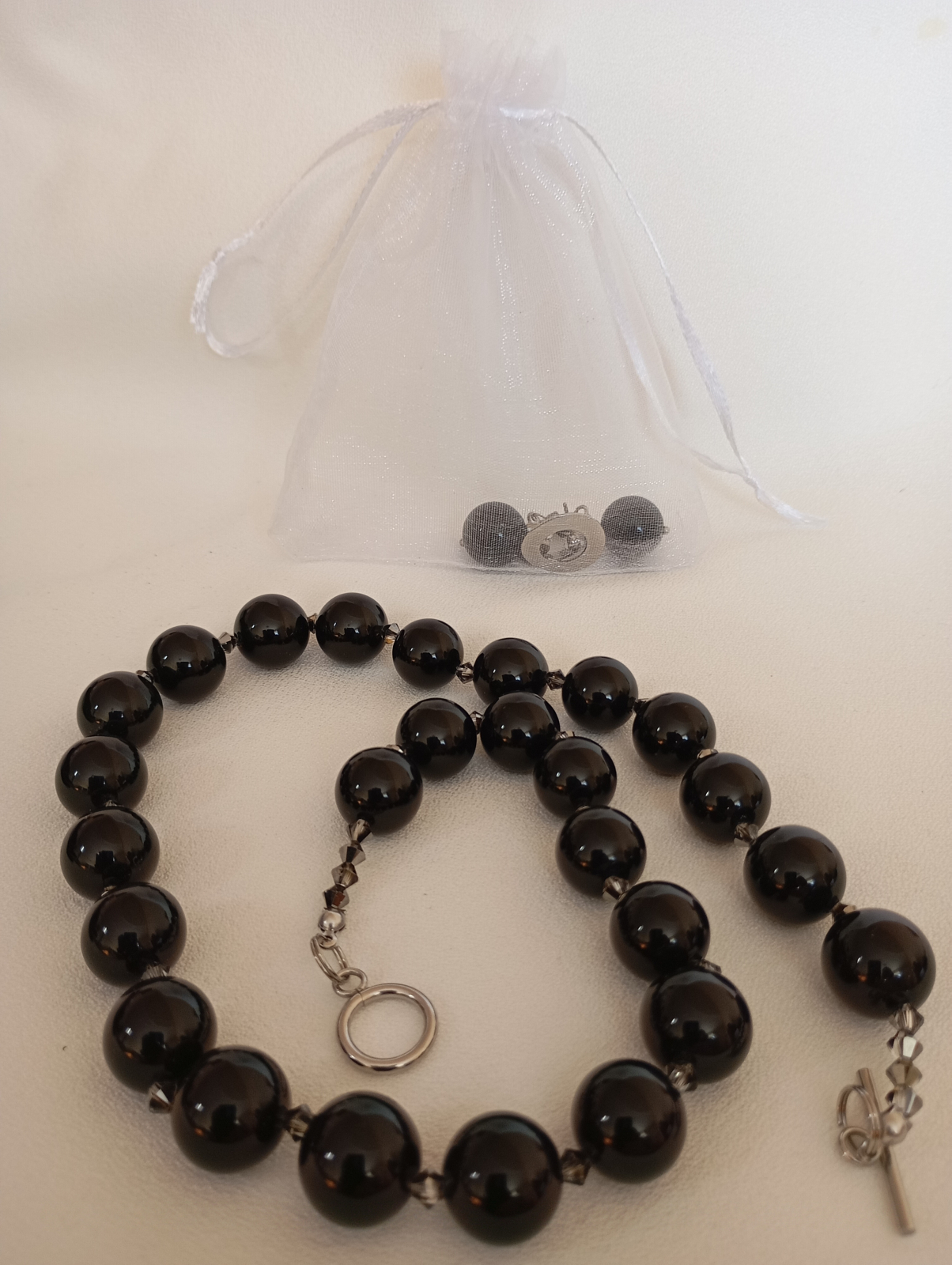 Set format din colier si cercei, cu piatra neagra lucioasa de Onix negru, 14 mm, accesorizat cu cristale Swarovski "black diamond"  4 mm.
