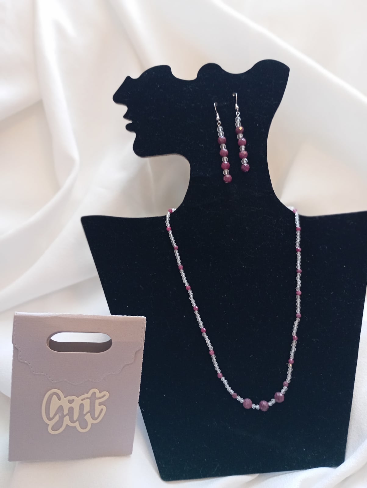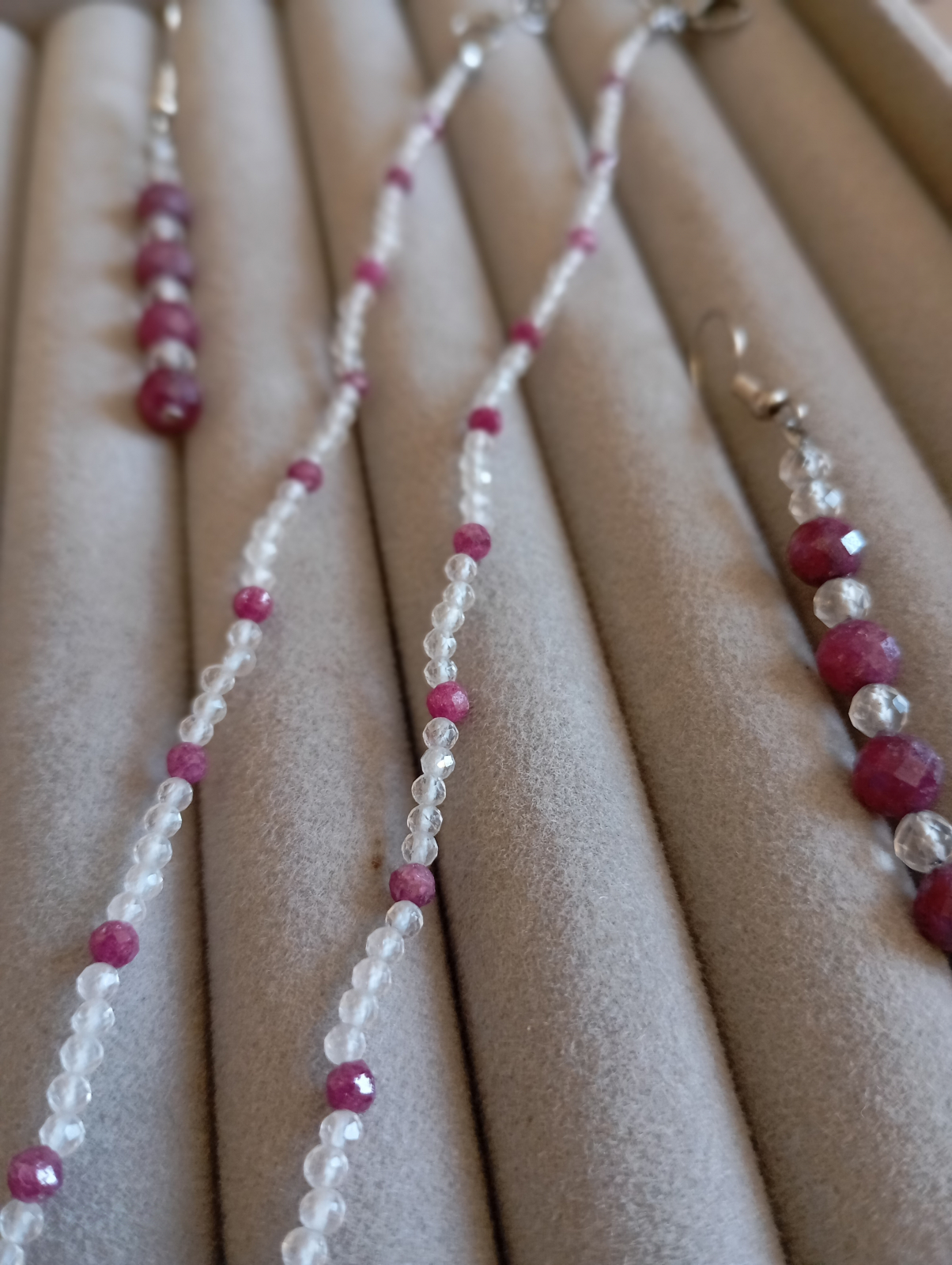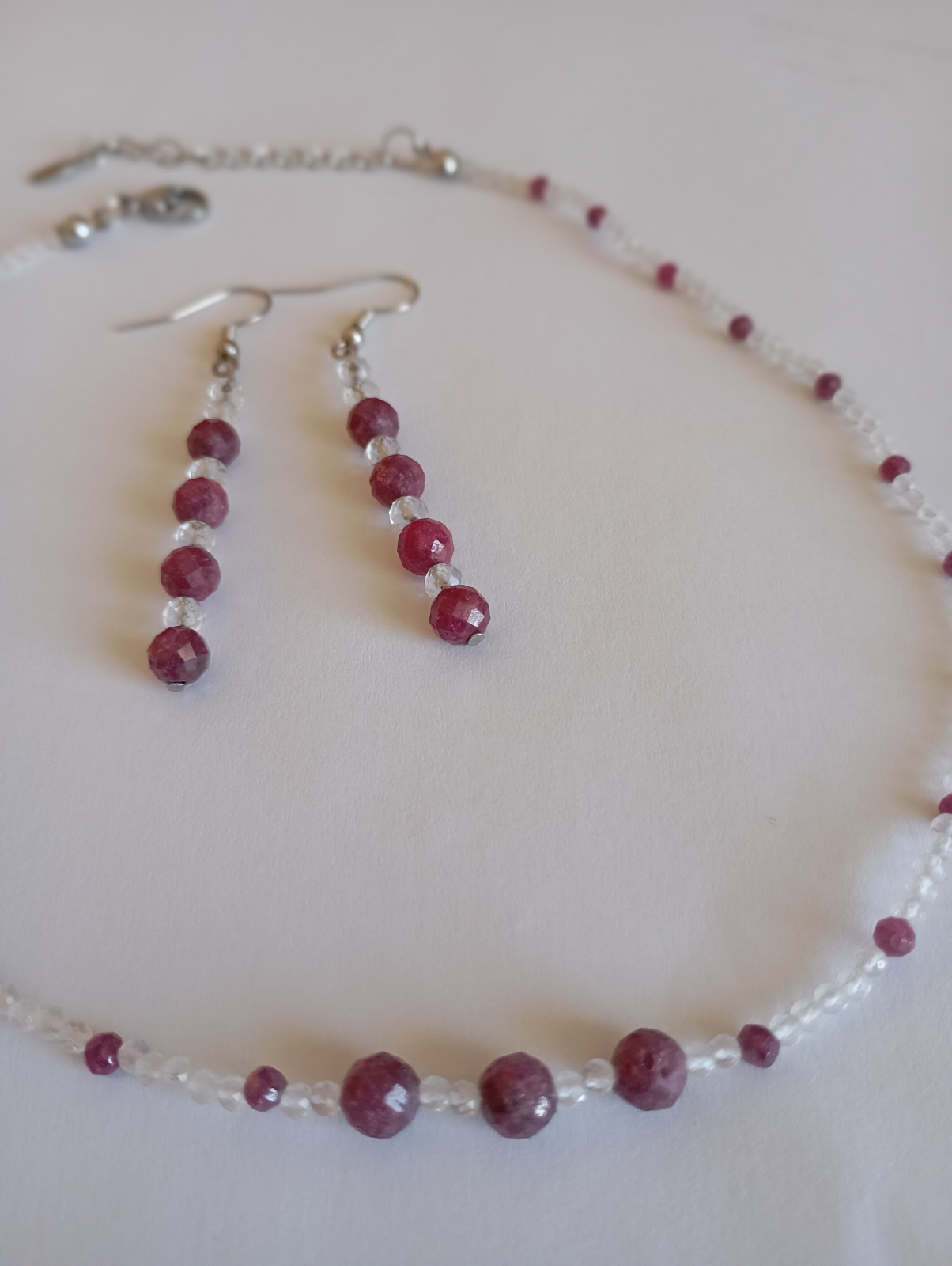 Set bijuterii handmade, colier si cercei cu margele brute de Rubin de 6 mm si 4 mm, cu stralucire discreta datorita aspectului fatetat, puse in evidenta de margelutele alb-transparente de cubic zirconia de 3mm. Accesorii din otel inoxidabil, antialergic.